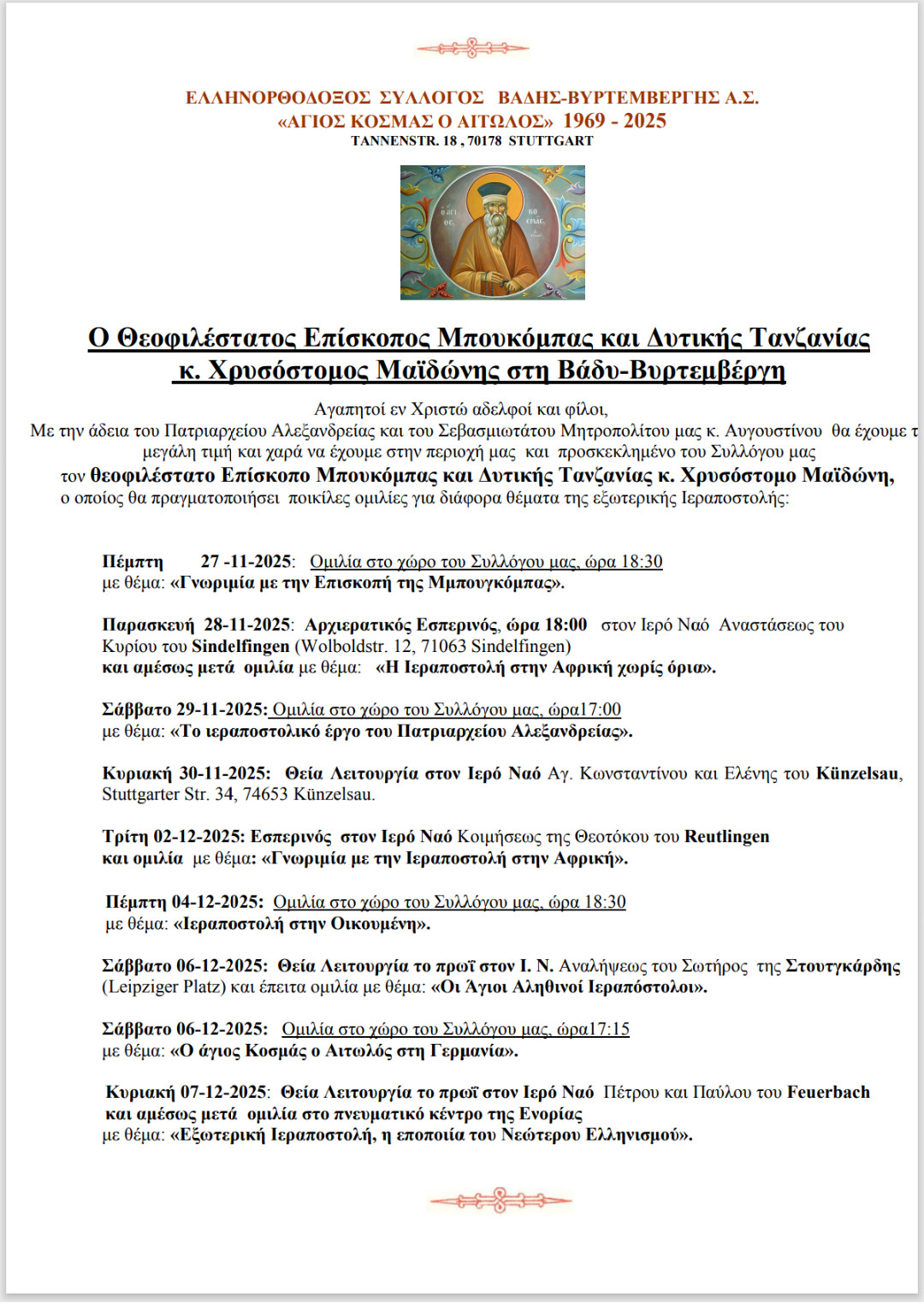 Η Ελληνορθόδοξη Κοινότητα Βάδης Βυρτεμβέργης «Άγιος Κοσμάς ο Αιτωλός» σας καλωσορίζει στην επίσημη ιστοσελίδα της. Ο διαδικτυακός αυτός τόπος αποσκοπεί στην στήριξη της Ορθόδοξης χριστιανικής παρουσίας στη Βάδη Βυρτεμβέργη μέσου του διαδικτύου και στη διάδοση των ανεκτίμητων αξιών του Ορθοδόξου Ελληνοχριστιανικού Πολιτισμού, κυρίως όμως στη διακονία του ποιμαντικού, φιλανθρωπικού και ιεραποστολικού έργου της Εκκλησίας.